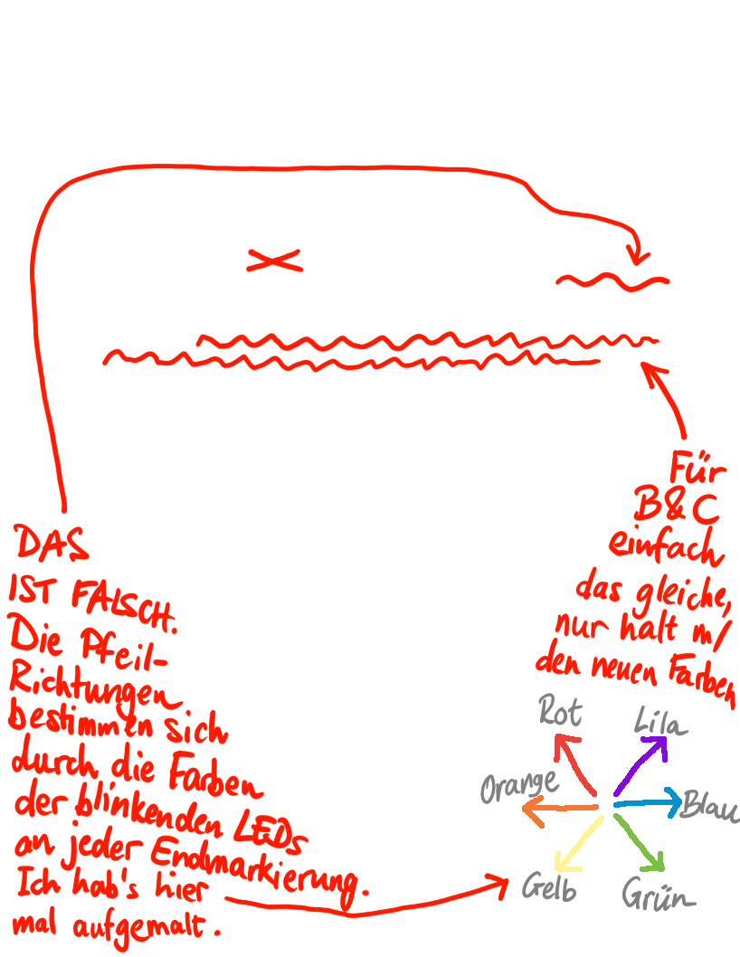 - Nach Betätigen der rechten roten Taste zeigt die Nadel ein neues Zahlenpaar. B wird dann durch die rechten Pfeile bestimmt. Nach erneutem Betätigen entspricht C den linken Pfeilen und neuem Zahlenpaar.